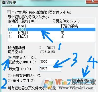 4、在虛擬內(nèi)存框中選擇其他磁盤盤符,然后點(diǎn)擊【自定義大小】,將初始大小設(shè)置為當(dāng)前內(nèi)存的大小,將最大值設(shè)置為 內(nèi)存的3倍大小,然后點(diǎn)擊【設(shè)置】;