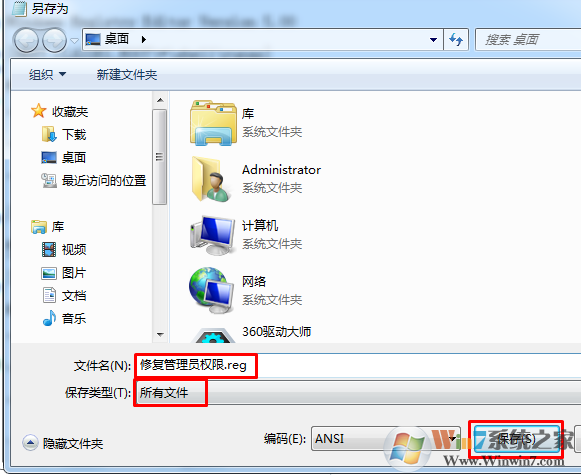 4、選擇好保存的目錄,方便待會(huì)打開,將保存類型修改為“所有文件”,然后將“文件名”修改為“修復(fù)右鍵菜單.reg”,點(diǎn)擊保存;