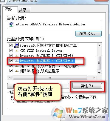 4、 在“無(wú)線網(wǎng)絡(luò)連接”右擊選擇屬性,在彈出界面點(diǎn)擊“internet協(xié)議版本4(TCP/IPv4)”,雙擊此項(xiàng)目或點(diǎn)擊“屬性”按鈕;