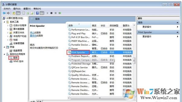 2、在打開(kāi)的“計(jì)算機(jī)管理”窗口中,依次展開(kāi)“服務(wù)和應(yīng)用程序”-》“服務(wù)”,并在右擊找到并雙擊“Print Spooler”項(xiàng)。