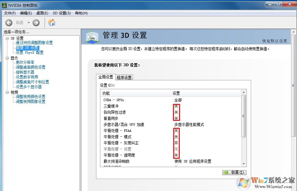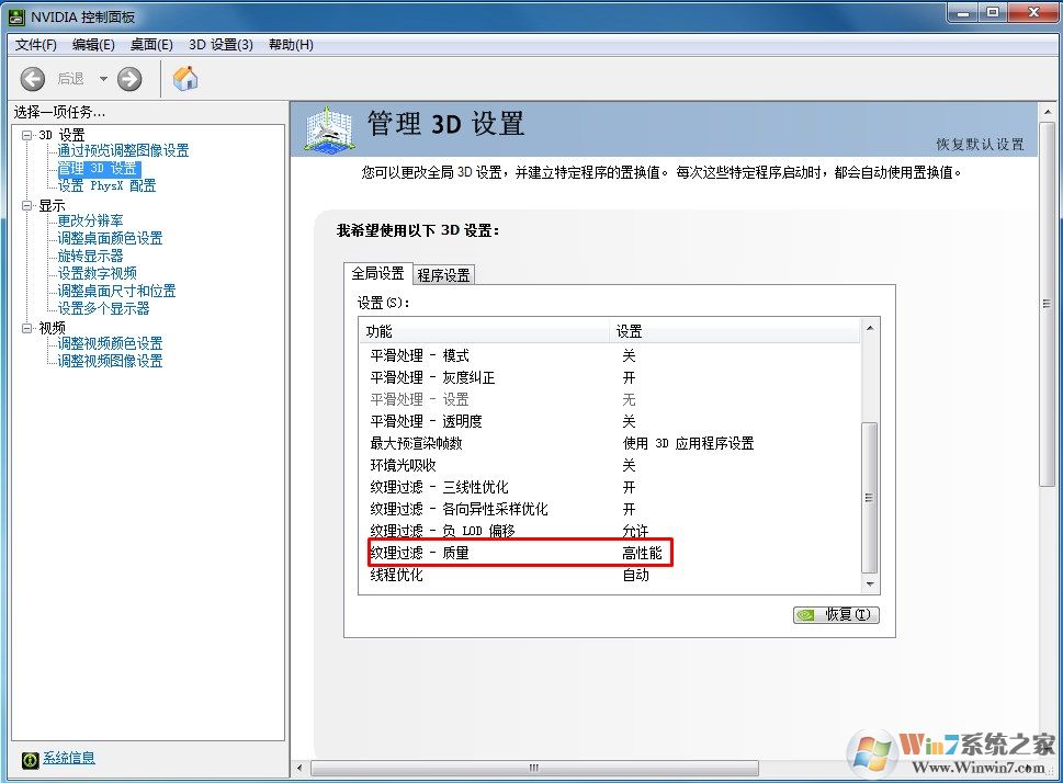 在管理3D設(shè)置中將小編標出來的功能關(guān)閉,然后把紋理調(diào)到高性能模式