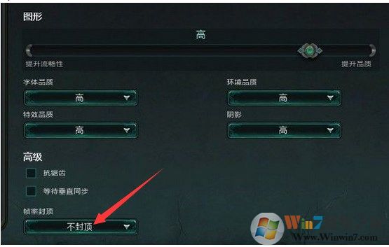 第一步、鎖定游戲里的FPS值,避免fps值上下浮動,如果是老顯卡我們可以調(diào)整到最低值,往上的顯卡就要自己多實驗幾次了,然后將特效和陰影等調(diào)低