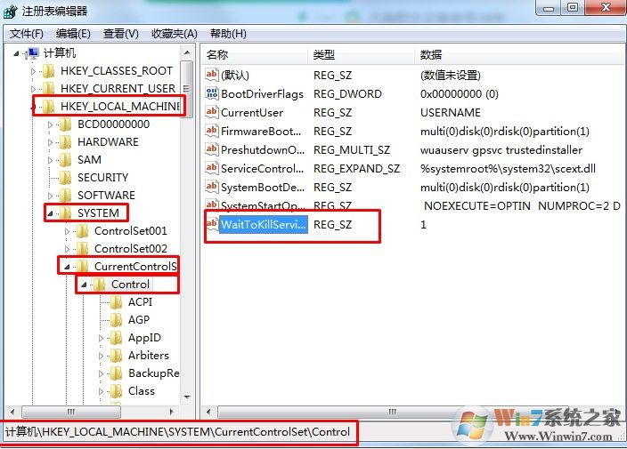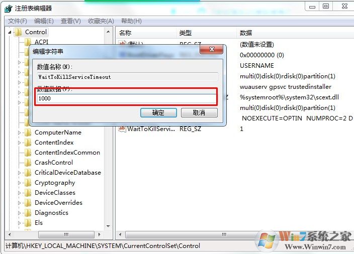 接下來(lái)就去找到HKEY_LOCAL_MACHINE/SYSTEM/CurrentControlSet/Control一項(xiàng)打開(kāi),可以發(fā)現(xiàn)其中有一項(xiàng)“WaitToKillServiceTimeOut”,鼠標(biāo)右鍵點(diǎn)擊修改可以看到Win7默認(rèn)數(shù)值是12000(代表12秒),這里可以把這個(gè)數(shù)值適當(dāng)修改低一些,比如5秒或是7秒。