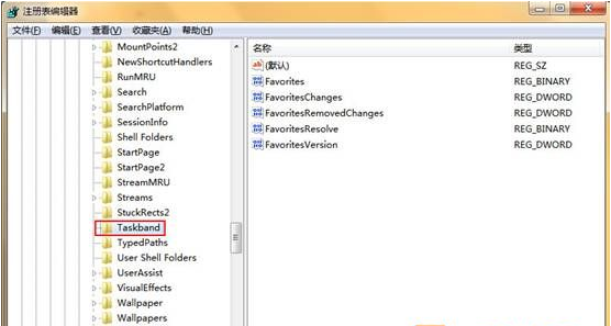 2、這時我們就進(jìn)入到了注冊表編輯器中,打開注冊表編輯器后打開“HKEY_CURRENT_USER”文件夾,接著依次打開“Software—Microsoft—Windows—CurrentVersion—Explorer--Taskband”文件夾,如下圖所示: