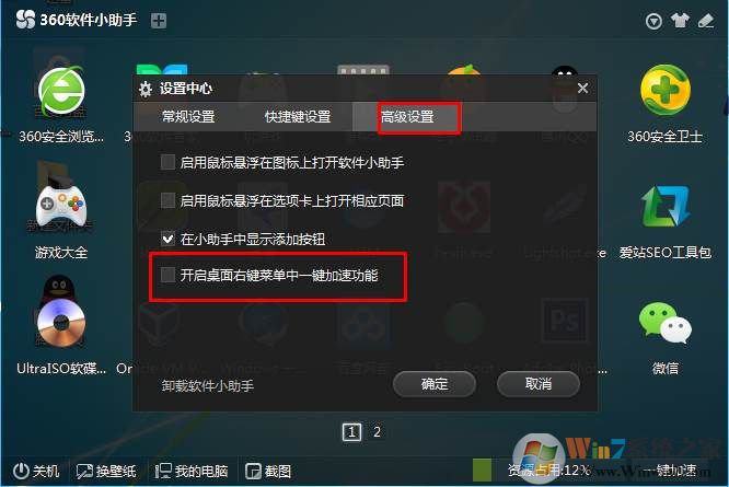 3、在高級設(shè)置中,關(guān)閉,開啟桌面右鍵菜單中的一鍵加速功能;