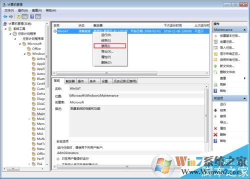 4、選中WinSAT,并右鍵,選擇”禁用“,這樣狀態(tài)變成了禁用了,以后這個(gè)工具就不會(huì)再運(yùn)行了