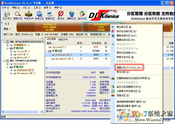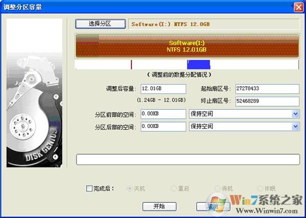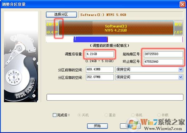 2、 調(diào)整分區(qū)大小時(shí),DiskGenius支持鼠標(biāo)操作,可以用鼠標(biāo)改變分區(qū)大小,移動(dòng)分區(qū)位置,切換調(diào)整后空間的處理選項(xiàng)等;也可以直接指定調(diào)整后的分區(qū)大小,對(duì)于有特殊要求的用戶,還可以設(shè)置準(zhǔn)確的起始與終止扇區(qū)號(hào),如下圖: