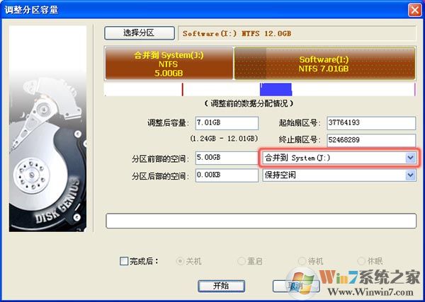 c. 按相同的方法,調(diào)整分區(qū)后部的空間,調(diào)整大小為2GB,調(diào)整選項(xiàng)為“合并到K:”,如下圖所示: