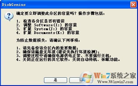 DiskGenius在開(kāi)始分區(qū)調(diào)整操作時(shí),也會(huì)提示您這一點(diǎn),如下圖: