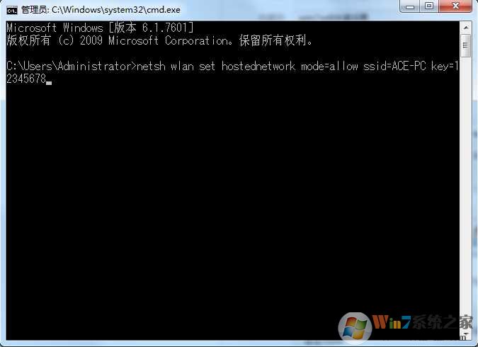 2、出現(xiàn)“命令提示符”輸入,在界面里輸入以下命令:netsh wlan set hostednetwork mode=allow ssid=ACE-PC key=12345678。回車運行
