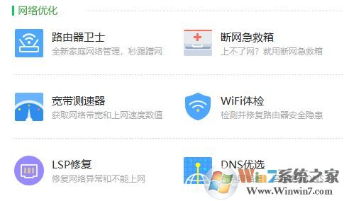 2、接著我們可以使用一些修復(fù)工具進(jìn)行修復(fù),如果電腦中有360的可以這么操作:打開(kāi) 360安全衛(wèi)士,點(diǎn)擊【功能大全】--【網(wǎng)絡(luò)優(yōu)化】,在網(wǎng)絡(luò)優(yōu)化界面使用“斷網(wǎng)急救箱”、“LSP修復(fù)”以及“DNS優(yōu)選”來(lái)進(jìn)行修復(fù)優(yōu)化一般即可解決問(wèn)題。