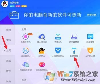 3、如果有電腦管家的話(huà)則可以打開(kāi)“工具箱”,左側(cè)一列找到上網(wǎng)---右側(cè)找到網(wǎng)絡(luò)修復(fù);