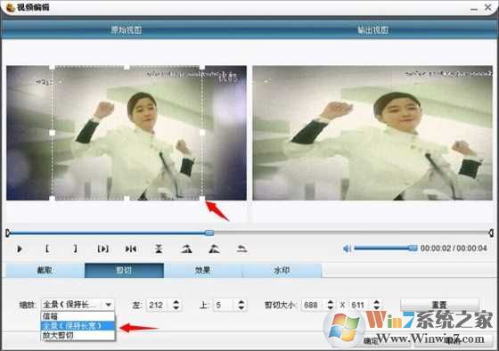 3、然后再點(diǎn)擊視頻編輯,然后裁剪視頻。把方框拉成正方形大小差不多的,再點(diǎn)擊下面的縮放,選擇全景(保持長(zhǎng)寬)如圖所示。最后點(diǎn)擊確定輸出視頻。