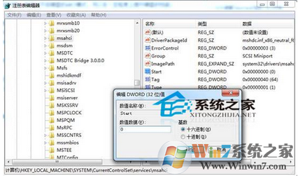 2.在“注冊表編輯器”窗口中,依次點開“HKEY_LOCAL_MACHINE/System/CurrentControlSet/Services/Msahci項,選中Msahci項,在右邊窗口中雙擊名稱為“Start”的項目,會彈出一個對話框,將默認的數(shù)值數(shù)據(jù)由3更改為0,點擊“確定”,重新啟動電腦。