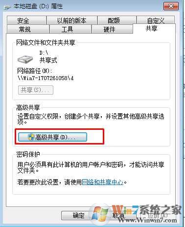 2、在共享選項下,點擊“高級共享”按鈕,如下圖: