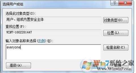 4、在選擇用戶和組這里添加everyone,確定;