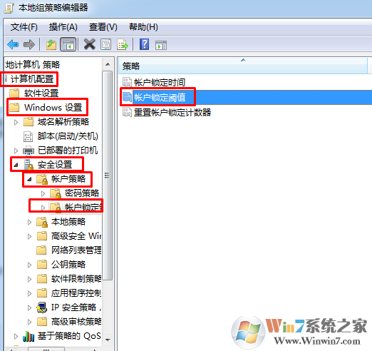 3.在“組策略編輯器”依次打開“計(jì)算機(jī)配置”-“windows設(shè)置”-“安全設(shè)置”-“賬戶策略”-“賬戶鎖定策略”。