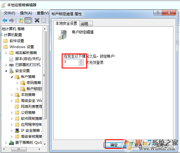 5.在“賬戶鎖定閾值屬性”對話框中選擇錯(cuò)誤次數(shù)鎖定,具體幾次就看自己的需求了,如圖所示:
