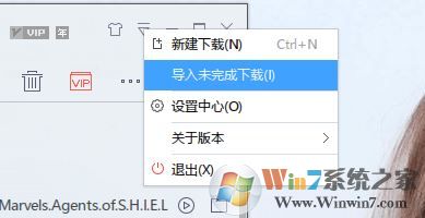 2、在迅雷主界面點擊 ▽ ,在彈出的菜單中點擊【導入未完成下載】選項;