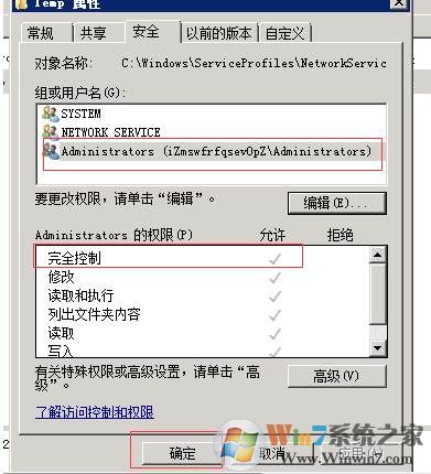 2.在“Temp”文件夾上點(diǎn)擊右鍵-->屬性-->安全-->選擇所創(chuàng)建的服務(wù)端賬戶名稱-->確定