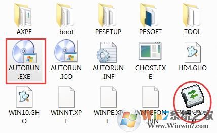 2、打開win10這個文件夾,我們不要直接打開gho文件,因為該文件是系統(tǒng)安裝鏡像文件我們需要使用軟件來進行打開安裝,雙擊 Autorun.exe 這個程序,當然你也可以直接點擊如“硬盤安裝.exe”,不過Atuorun.exe中包含了一些功能,如備份資料等;