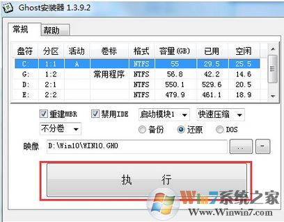 4、此時會彈出gho安裝器,在彈出的框中一般會默認選擇相同文件夾中的gho文件,然后我們在盤符中選擇當前系統(tǒng)所在磁盤盤符,點擊執(zhí)行即可開始安裝!