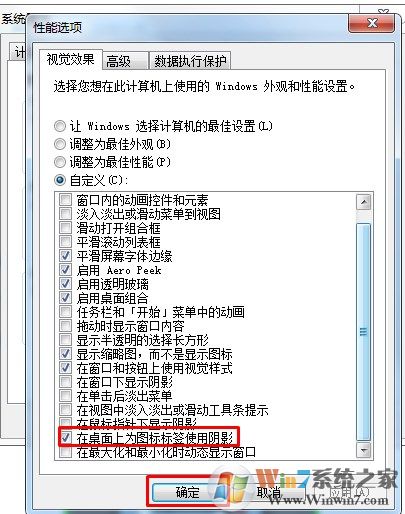 4、在“性能選項”的對話框,選擇“視覺效果”欄。找到“在桌面上為圖標標簽使用陰影”選項,將前面的“√”去掉,點擊“確定”即可。