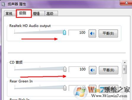 4、切換到“級(jí)別”選卡,可將其調(diào)節(jié)到最大,然后將下面的那些音量調(diào)節(jié)通通調(diào)到最大然后點(diǎn)擊確定保存設(shè)置即可!