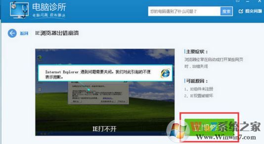 1、針對(duì)瀏覽器崩潰的問題,可以借助“電腦管家”所提供的“電腦診所”工具進(jìn)行修復(fù)操作。只需要在其中搜索“IE瀏覽器崩潰”并點(diǎn)擊如圖所示“立即修復(fù)”按鈕嘗試解決。
