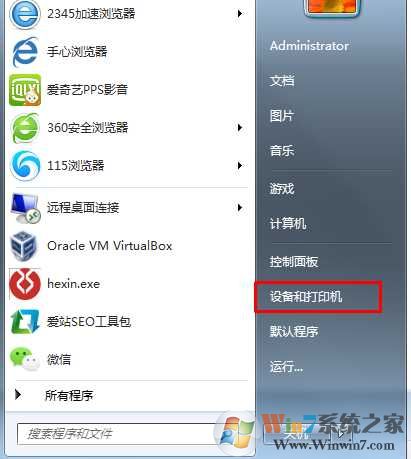 1、從開始菜單打開“設(shè)備和打印機(jī)”;