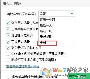 在清除上網(wǎng)痕跡中,把“清除這段時間的數(shù)據(jù)”設(shè)置為“全部”;