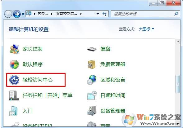 2、進(jìn)入控制面板界面后,我們選擇查看方式為大圖標(biāo),然后找到”輕松訪問中心“,點(diǎn)擊進(jìn)去;