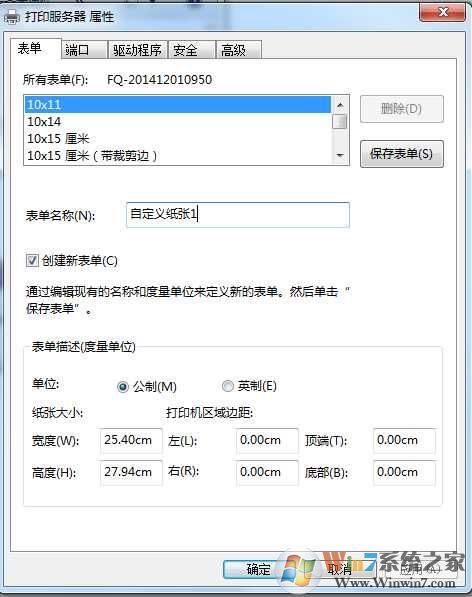 4、設置完成后保存表單。之后就可以在打印機紙張設置中找到我們新添加的打印尺寸了