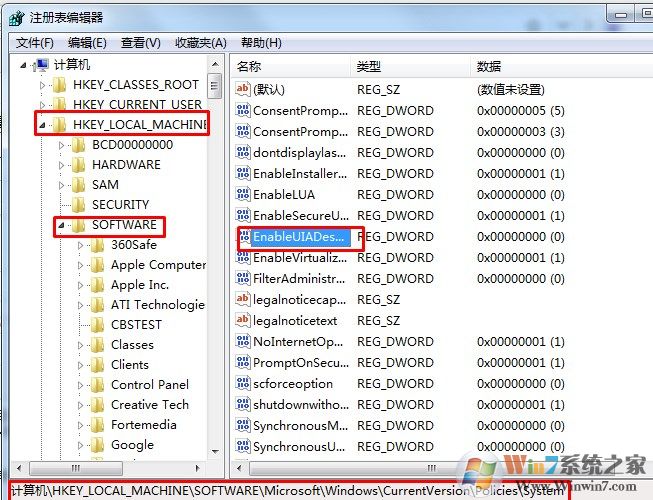 二、接著在注冊表上,展開下列路徑HKEY_LOCAL_MACHINE/SOFTWARE/Microsoft/Windows/CurrentVersion/ Policies/System,然后在右側(cè)窗格中找到EnableUIPI鍵值,并右鍵單擊EnableUIPI選擇“刪除”。
