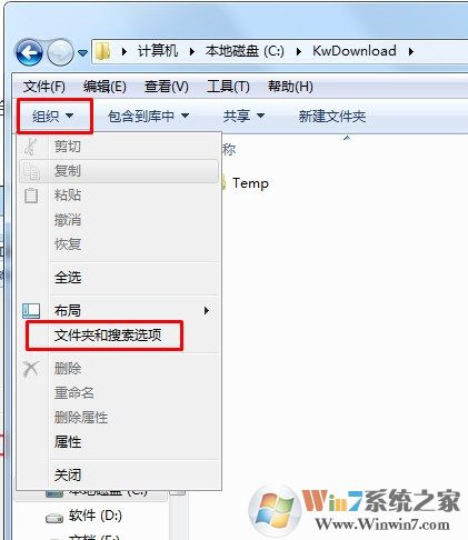 1、在桌面按下“WIN+E”組合鍵啟動資源管理器,然后在彈出來的界面中點擊左上角的“組織”選項,并且選擇“文件夾與搜索選項”;
