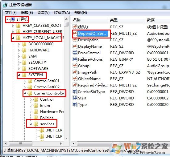 2在打開的注冊表編輯器上,依次展開HKEY_LOCAL_MACHINE/SYSTEM/CurrentControlSet/Services/Audiosrv,然后在右側窗格中找到DependOnService項目。