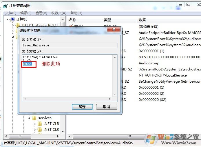 3、雙擊打開DependOnService鍵值,在打開的編輯窗口中刪除MMCSS,保留其他數(shù)值,點擊確定按鈕退出注冊表編輯器。