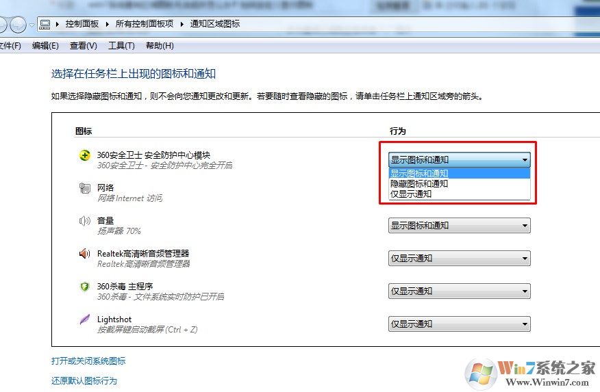 3、接下來我們就可以在上方的圖標(biāo)管理區(qū)域設(shè)定通知和顯示方案了