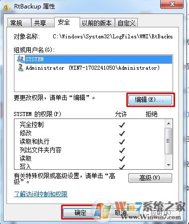 1、打開Win7系統(tǒng),然后在打開C:\windows\system32\logfiles\wmi\RTbackup文件夾,右鍵單擊選擇“屬性”。在RTbackup屬性面板上,切換至“安全”選項卡中,在組或用戶名下,點擊“編輯”按鈕。