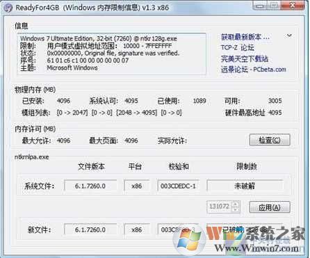 下載解壓后,先運行Readyfor 4GB,當(dāng)程序打開后,依次點擊檢查和應(yīng)用選項,此時程序會告訴你所用系統(tǒng)能夠支持最大內(nèi)存容量和當(dāng)前內(nèi)存容量。一下的圖片是筆者已經(jīng)破解后所示,最大允許4GB內(nèi)存。