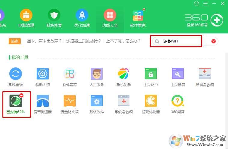 1、打開360衛(wèi)士,然后在功能中查找免費(fèi)wifi 然后安裝并打開。