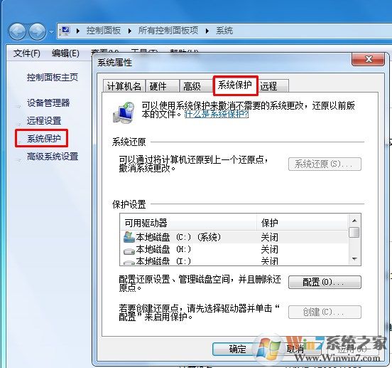 2、點(diǎn)擊配置按鈕,關(guān)閉Win7系統(tǒng)C盤的保護(hù)功能;