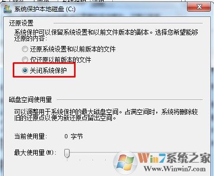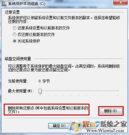 3、保護(hù)功能關(guān)閉后,我們還要將原來創(chuàng)建的還原點(diǎn)全部刪除,如下圖:
