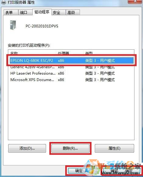4、選擇相應(yīng)打印機(jī)屬性,點(diǎn)擊【刪除】。如果有多個(gè)打印機(jī),不要?jiǎng)h錯(cuò)了。
