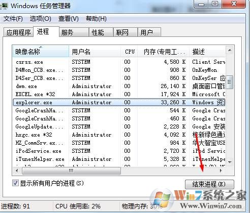 1、右鍵點(diǎn)擊任務(wù)欄打開(kāi)任務(wù)管理器,然后在進(jìn)程中找到explorer.exe,點(diǎn)擊結(jié)束任務(wù);