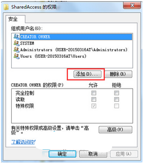 2.在“SharedAccess權(quán)限”窗口中,單擊“添加”。