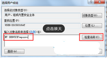 3.在“輸入對(duì)象名稱來選擇”下方的文本框中輸入“NT SERVICE\mpssvc”;然后點(diǎn)擊右側(cè)的“檢查名稱”。