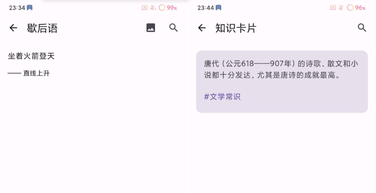 是一款免費開源集上萬首古詩詞、名句、上萬條歇后語、成語等于一身的查詢閱讀小工具,另外附帶常用的知識卡片。簡言之,可充分了解、賞析各種類型的古詩作品,包括唐詩、宋詞、元曲、楚辭、歌賦等,涵蓋各個朝代和流派,滿足不同興趣和需求。由于諧音成語的盛行,反而導致了原版字樣的zt。另外,相比那些第三方功能有限制又彈廣告又要求登錄的同類app,這款可謂是清爽多了,無需注冊即可體驗。