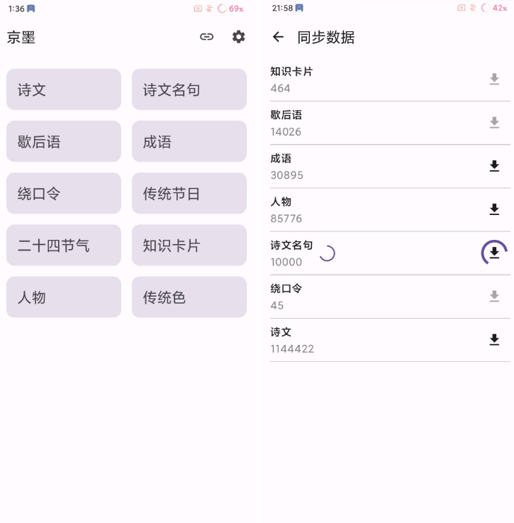 - 古詩詞文:收錄了110萬篇詩詞,包括詩、詞、辭賦、殘句、聯(lián)和文等;