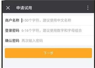2、填寫商戶名稱并設(shè)置登錄密碼,點(diǎn)擊【下一步】